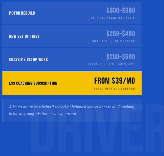 Stop leaving time on the table. Join the coaching subscription and start building the skills, strategy, and mindset that separate fast racers from the rest.