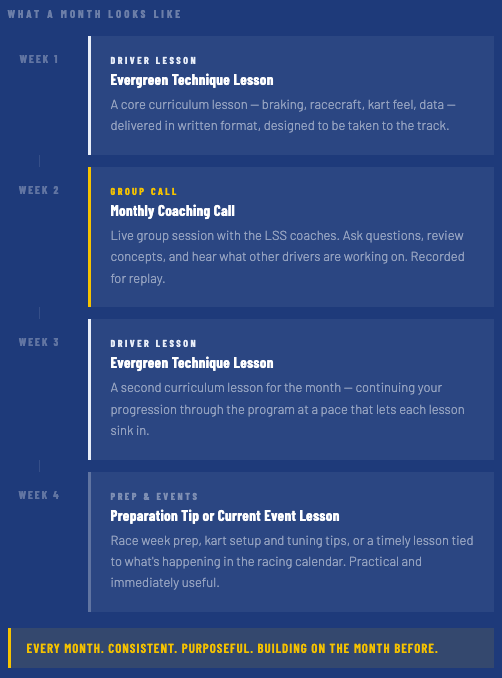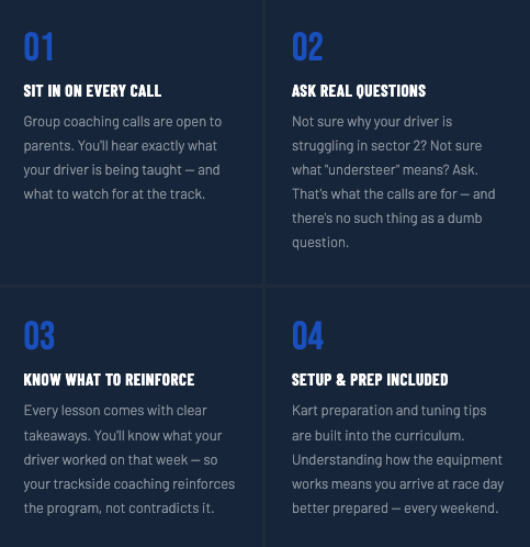 This program includes you. Parents are welcome on every group call. Ask questions. Take notes. Learn the vocabulary. When you know what your driver is building toward, the conversations in the paddock change — and so do the results.