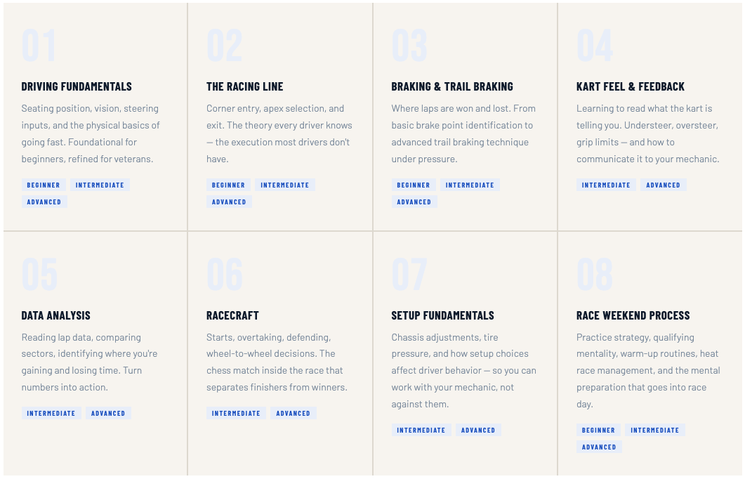 Every module scales with you. A beginner working through Module 3 is learning brake points. An advanced driver working through the same module is refining trail braking entry technique under race pressure. The curriculum doesn't cap out — it goes as deep as you want to go.